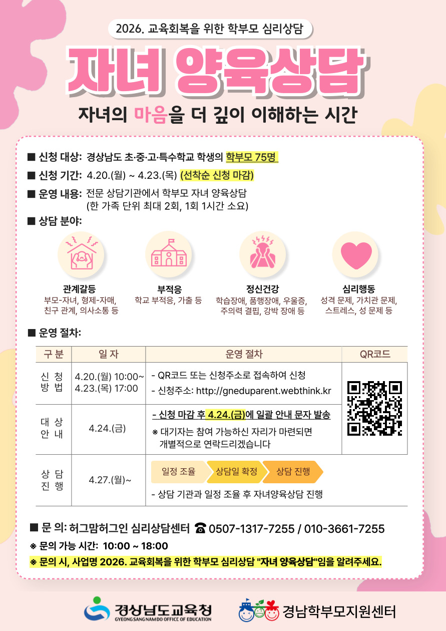 경상남도교육청에서는 사랑하는 자녀와 소중한 소통, 연결에 어려움을 가진 학부모를 위하여 학부모 자녀양육상담프로그램을 운영합니다. 참가를 희망하는 학부모님은 안내 사항을 참고하셔서 신청하시기 바랍니다.
