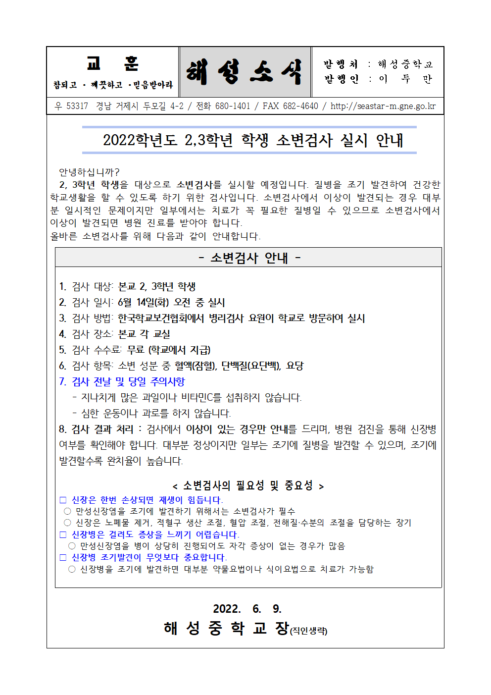 2022.2,3학년 소변검사 실시 안내