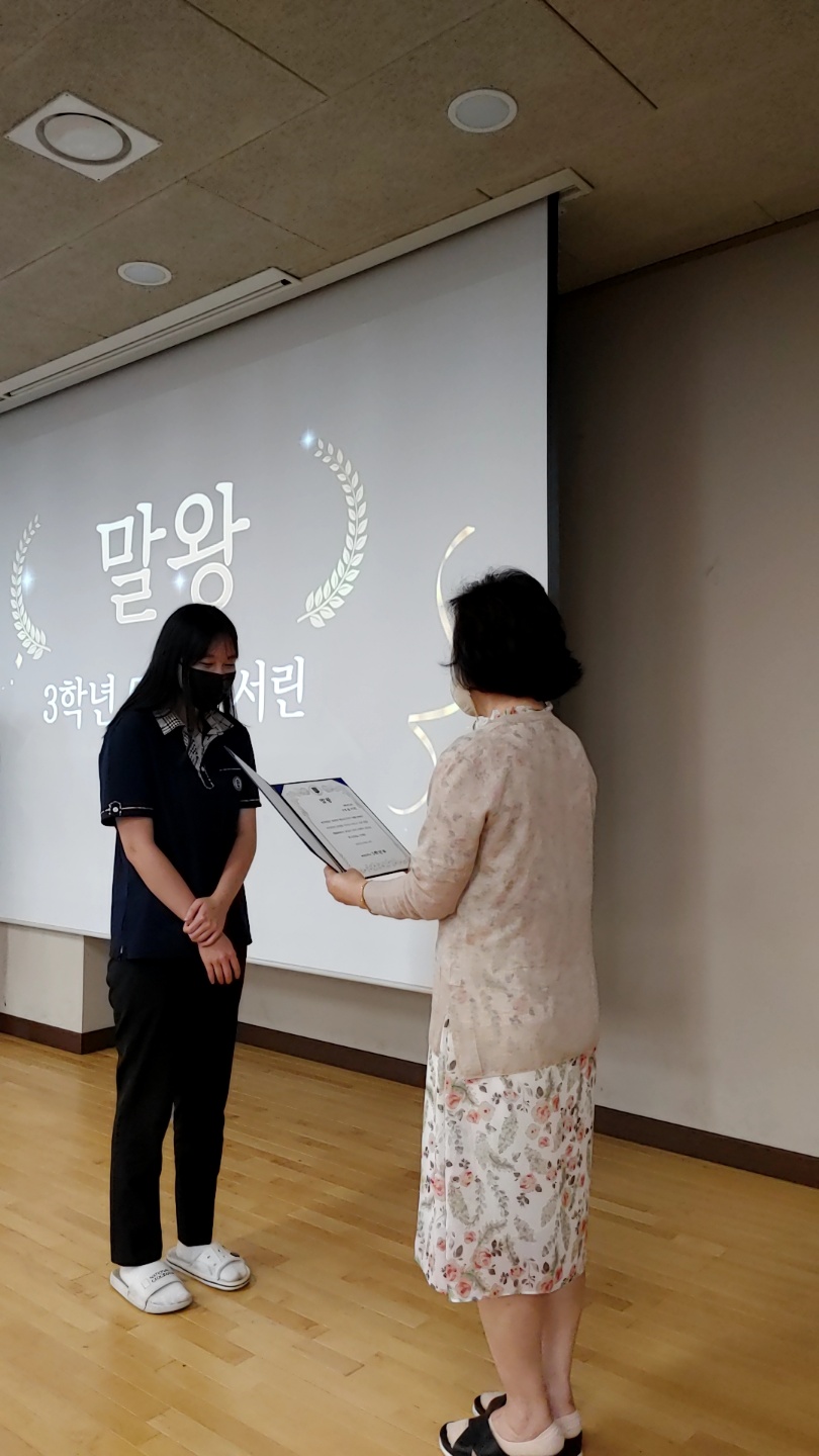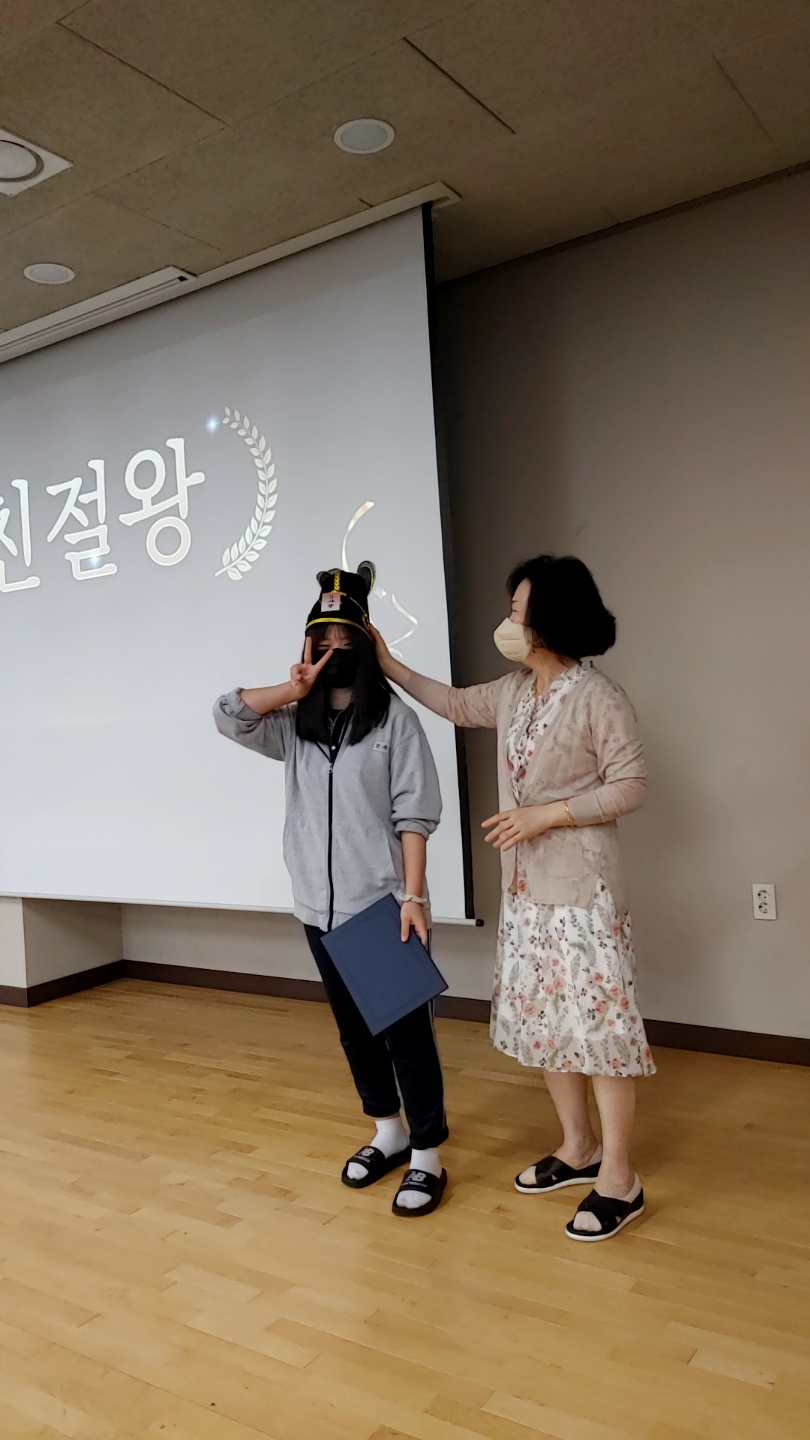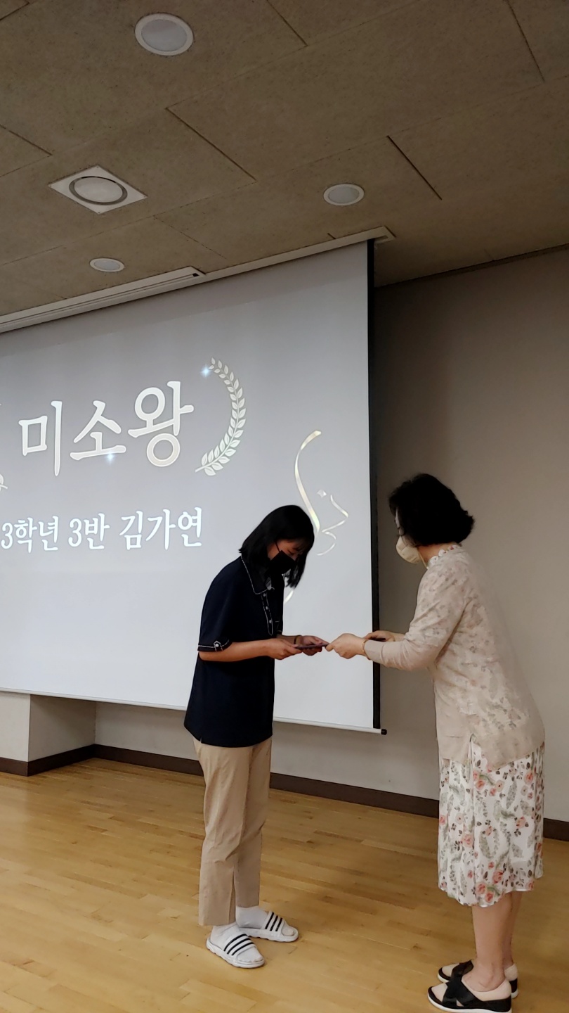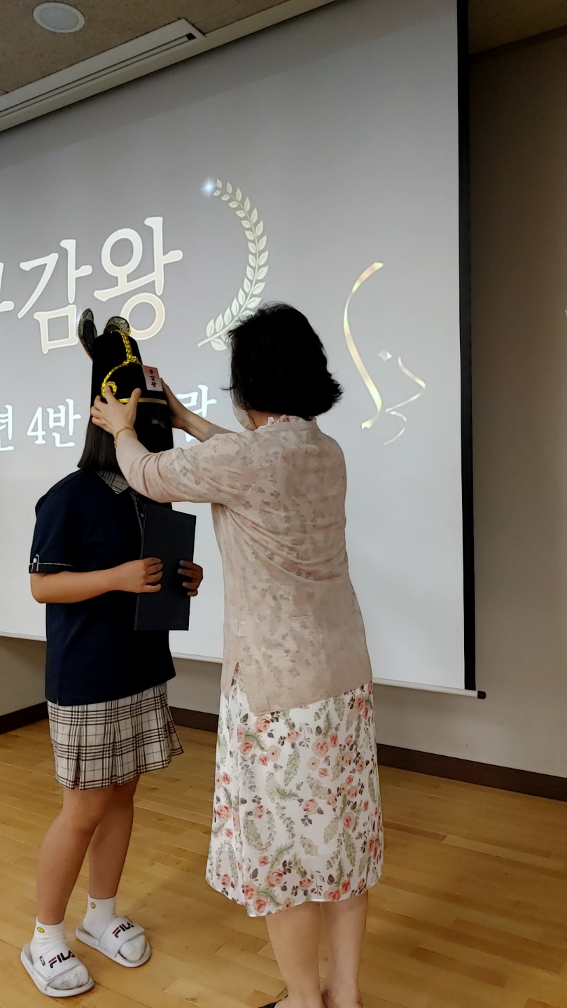 안녕하십니까~ 신바람나는 3학년부 김소이입니다. 7월 12일 3학년들의 "제2회 나도왕 시상식"이 있었습니다. 첫번째 나도왕 시상식의 경험을 바탕으로 어떤 친구들이 수상의 영광을 얻을지 확인하는 흥미진진한 시간이었습니다. 이번에도 친구들의 박수를 받으며 교감 선생님께서 직접 상장을 수여해주시고, 왕의 모자인 익선관을 씌워주셨습니다.