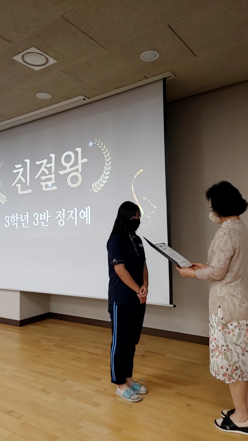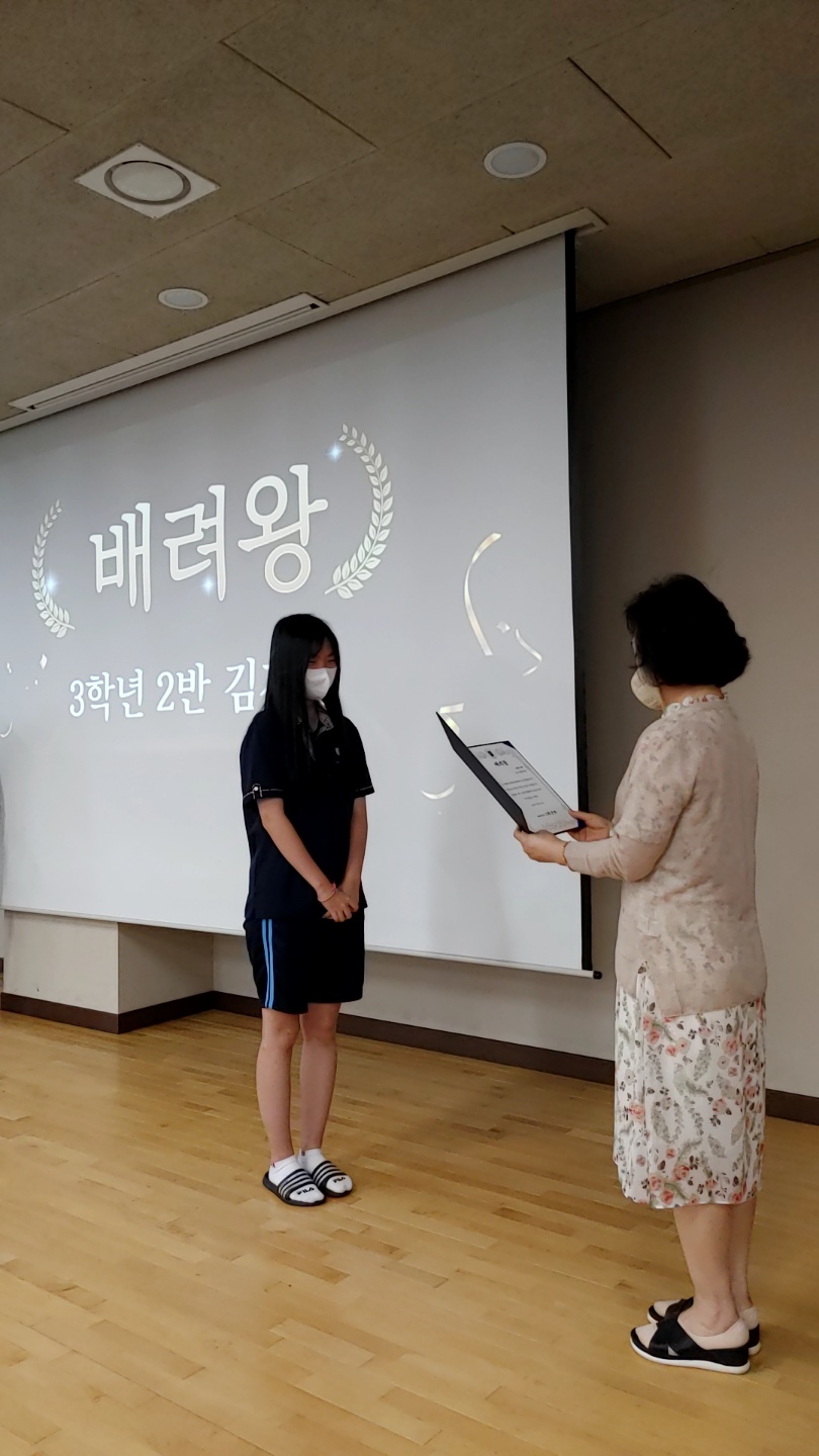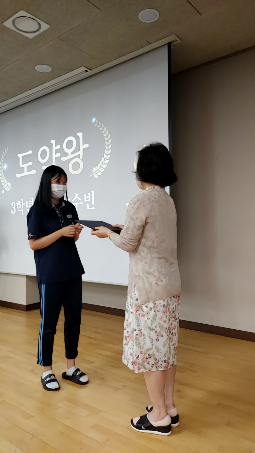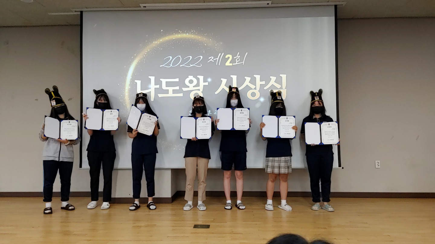 안녕하십니까~ 신바람나는 3학년부 김소이입니다. 7월 12일 3학년들의 "제2회 나도왕 시상식"이 있었습니다. 첫번째 나도왕 시상식의 경험을 바탕으로 어떤 친구들이 수상의 영광을 얻을지 확인하는 흥미진진한 시간이었습니다. 이번에도 친구들의 박수를 받으며 교감 선생님께서 직접 상장을 수여해주시고, 왕의 모자인 익선관을 씌워주셨습니다.
