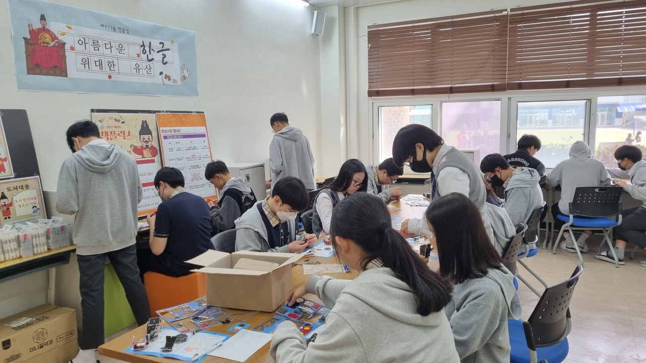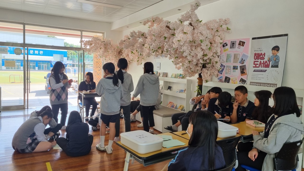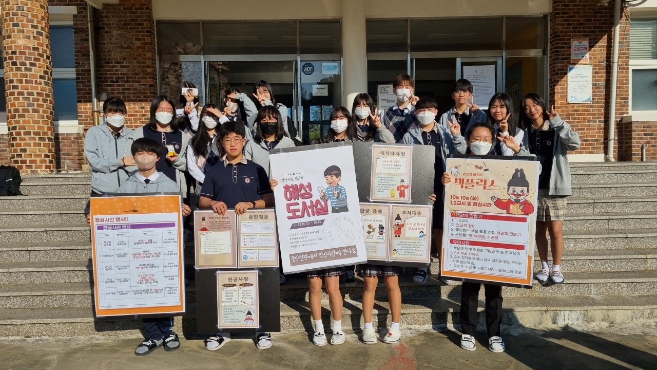 10월 2째 주 ‘행복한 책읽기’ 활동으로 도서부와 함께 책플릭스 행사가 있었습니다. 한글을 만들어주신 세종대왕님의 뜻을 기리는 행사를 비롯하여 현재 교내 공사로 도서실 이용이 어려워 책을 대출하지 못하는 학생들을 위해 찾아가는 도서 대출 활동을 하였습니다. 그 외에도 책갈피 만들기, 해성중 타자왕, 한글 공예 체험, N행시 쓰기, 손글씨 뽐내기 등을 통해서 해성인들의 적극적인 참여가 많아 풍성한 가을독서 행사가 진행되었습니다. 책읽기 딱! 좋은 날씨입니다. 책과 함께 깊어가는 가을을 만끽해 보세요~