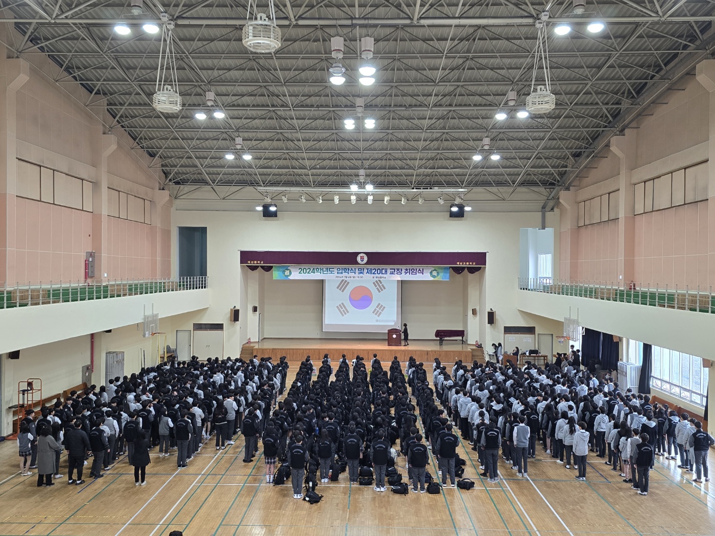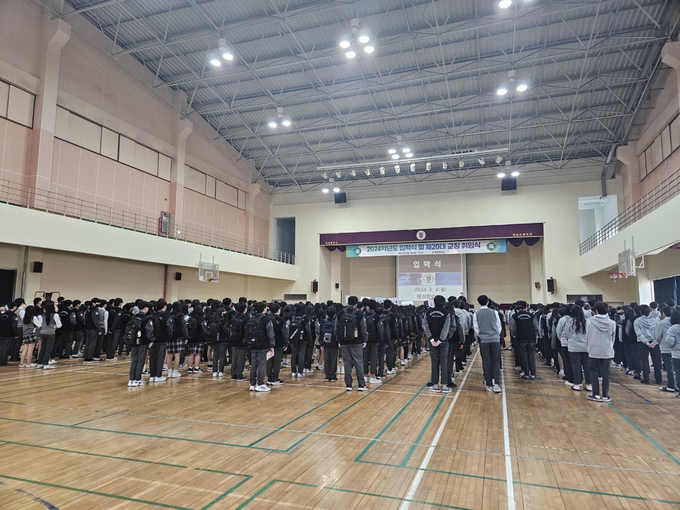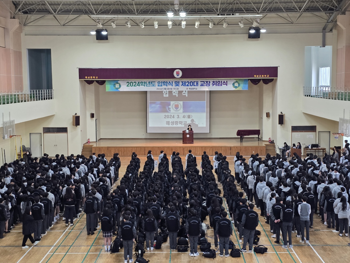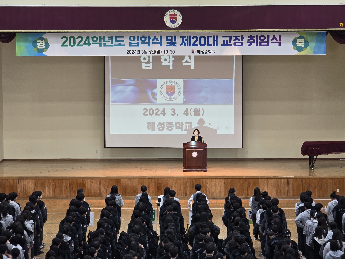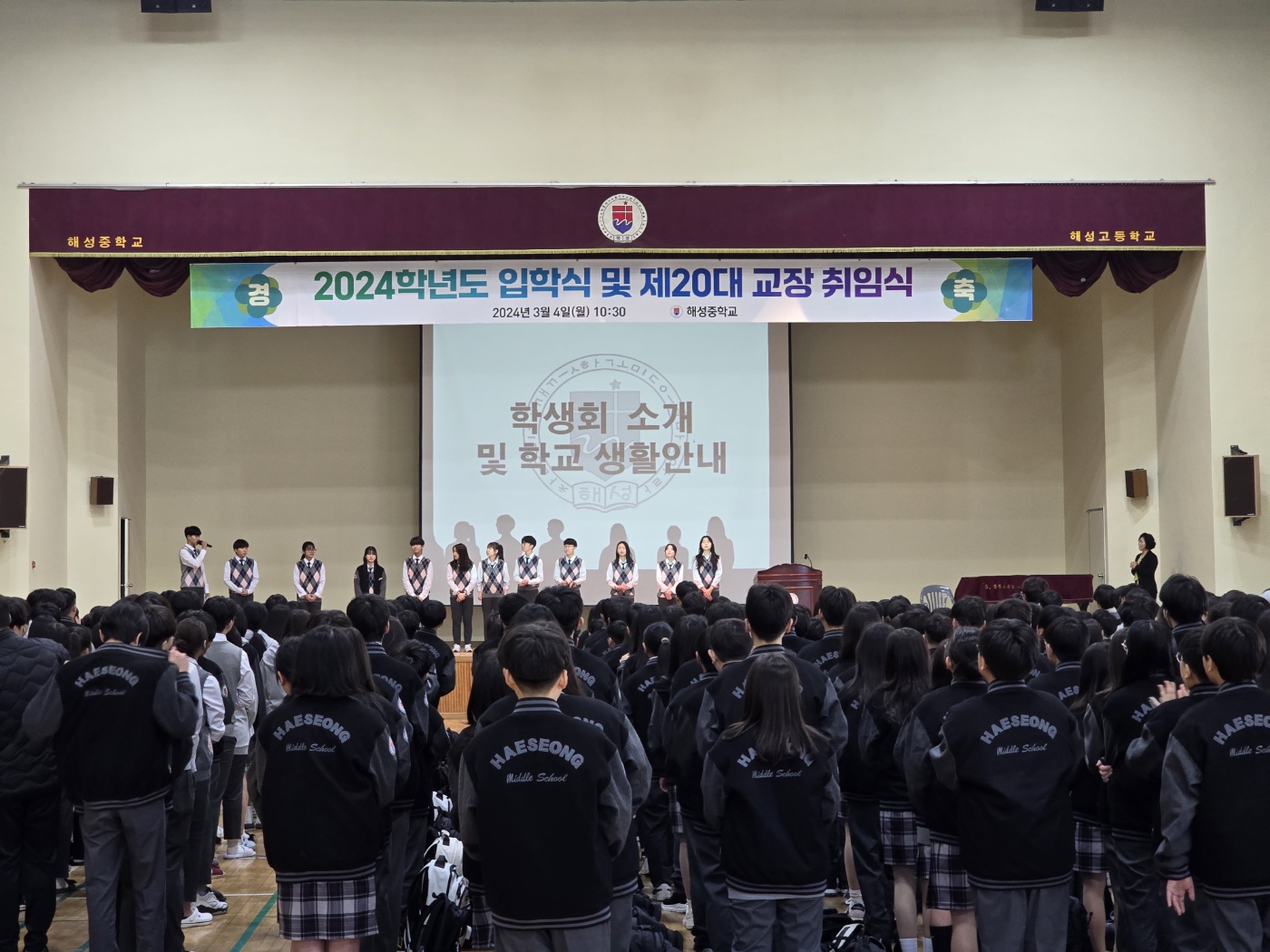 3월 4일 진행된 "2024학년도 해성중학교 입학식 및 제20대 교장 취임식" 사진입니다.